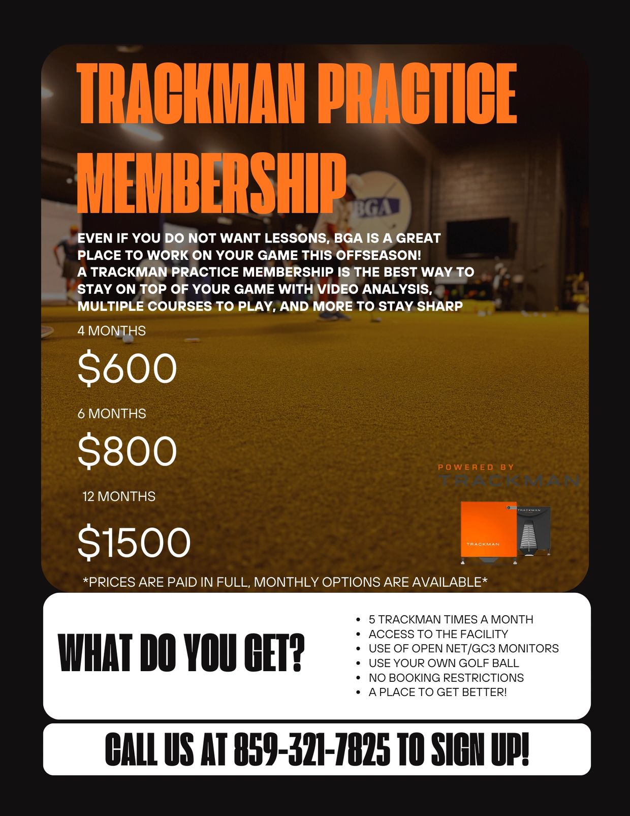A practice membership at Bluegrass Golf Academy is a great way to work on your game all year around! This membership provides access to trackman bays, facility access, as well as all of BGA's training aids and tools to help you improve!